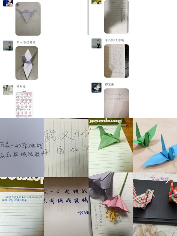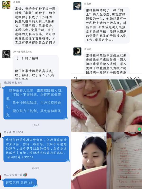 班会由金华康素导主持,以语音连线的方式开展。班会伊始,素导以“什么是雷锋精神”为题展开相关讨论,同学们各抒己见,纷至沓来,班会气氛十分活跃。接着素导为同学们讲解了雷锋的事迹,深度向学生阐述了新时代的雷锋精神:“向上的人生姿态,向善的价值追求”的引导学生在学习中善于“挤”和“钻”,在疫情中积极投身志愿者行列,用行动奉献爱心。并借雷锋故事引出抗“疫”时期的典型:具有“国士”气度和风范,奋力抗击在一线的钟南山院士;身患渐冻症,在抗击疫情中不幸感染肺炎,仍用实践默默坚守,诠释医者仁心的张定宇医生。同学们根据榜样们的模范事迹展开讨论,其中朱鑫月同学谈到“书店老板挨家挨户为学生送去课本”这类发生在身边的暖心故事,引发同学共鸣,他们在自己准备好的信纸上写上“万众一心迎挑战,众志成城战疫情”的等励志话语为武汉加油。随后,宣传委员张含靖同学用直播教学叠千纸鹤的环节将班会推向了高潮,他们每个人亲手叠的千纸鹤都承载了一份祝愿,为身在抗“疫”一线的人们送去希望。最后,班会在同学们铿锵有力的“学习雷锋好榜样”的歌声中结束。