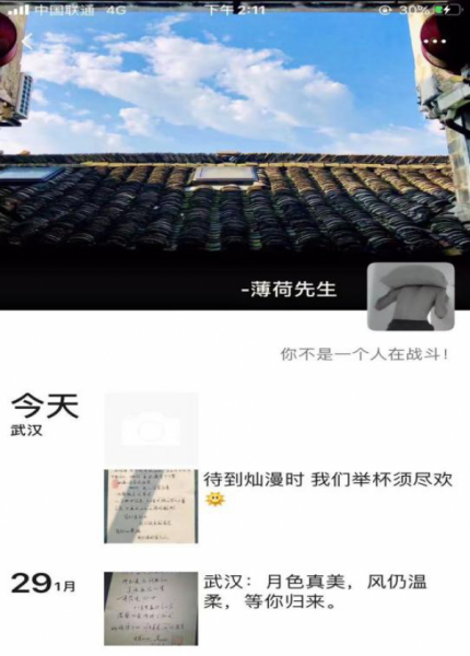 高亚文,作为一名土生土长的武汉人,同时又是95后退伍大学生,当他看到受疫情的感染和死亡人数这些令人心痛的数据时说到:“医护人员以及各路爱心人士都为守住这座城战斗在疫情前线,我应该和广大中国人民一样在背后给予他们支持、鼓励和希望。”1月29日,疫情越发严重,高亚文便在网上鼓舞人心,借鉴励志短语,弘扬正能量。空闲之时,还协助退伍军人俱乐部开展公益活动,为其出谋划策,做到“稳而不乱,强则有效”。