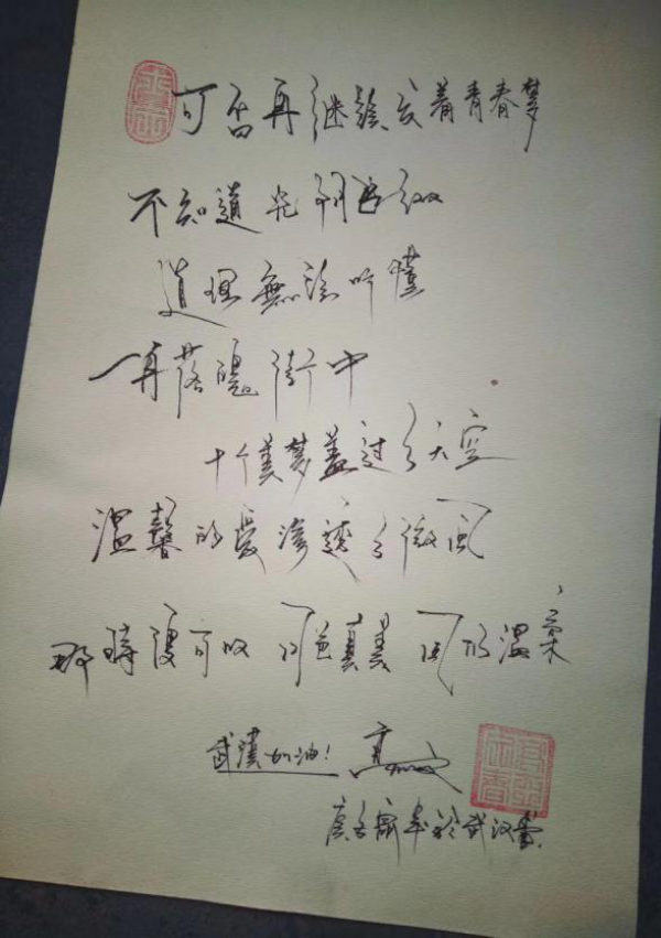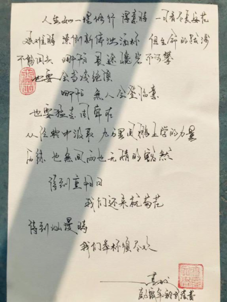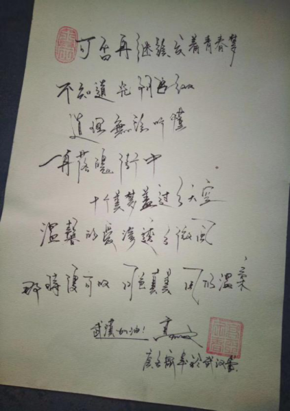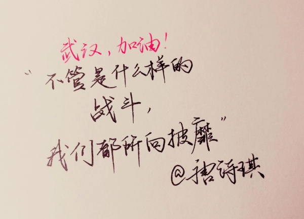 一名叫唐诗琪的大一新生,在武汉疫情爆发之际,用文字寄语暖心武汉人民。当唐诗琪同学想到一线的工作人员仍在冲锋陷阵,他们以血肉之躯保护着我们和国家是,所以她写下“不管是什么样的战斗,我们都所向披靡”她相信这次疫情虽然来势凶猛,但武汉人民,湖北人民,全国人民绝不向它屈服!记者采访到唐诗琪同学时,她说道:“虽然此刻武汉人民减少了外出,但是疫情结束之后,我相信外面的阳光会更加的灿烂!”