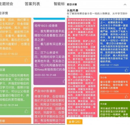 在班会过程中,金华康、李曼殊、殷智敏、陈梦等素导还开展了头脑风暴、讨论答疑的活动,他们以“你了解到有哪些奋斗在一线的人物事迹,从中学习到什么”、“除了武汉肺炎外是否还有关注其他事件?”、“在疫情期间,你最关心的问题是什么?”、“疫情期间,我们应该怎样去提升自己?”等问题与同学深度交流,相互沟通,从而达到了理想的教育效果。这次班会让同学们在讨论过程中,逐渐领悟和感受到战“疫”一线工作人员的大无畏精神,踊跃抒发对祖国的歌颂,更加坚定战胜疫情的信心,更加珍惜学习机会,并潜移默化的转化为自我奋斗的动力且为之努力。