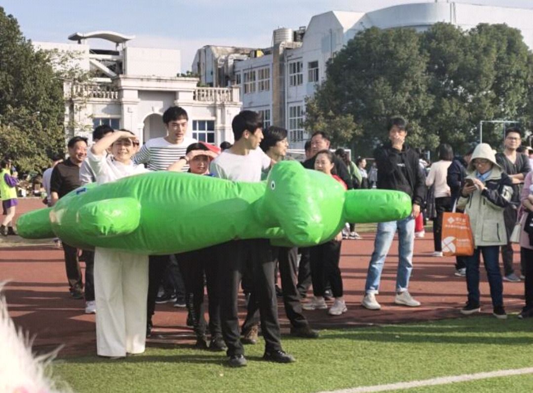 据了解,教工组特色趣味活动比赛形式以团体赛展现,以学院为单位,派出教师代表参赛。“同甘共苦”以一根杆子为依托,需要8人同时手握横杆绕过障碍物一圈;“龟兔赛跑”则是需要将各学院参赛的15人分为三组,每组5人站在提前准备好的“兔子”和“乌龟”图案的充气道具中,以三次接力赛形式完成比赛;“动感五环”需要各学院参赛的12人分成三组,1人站在“五环”中奔跑,另外3名队员协调配合推动“五环”向前进行,以三次迎面接力的形式完成比赛。
