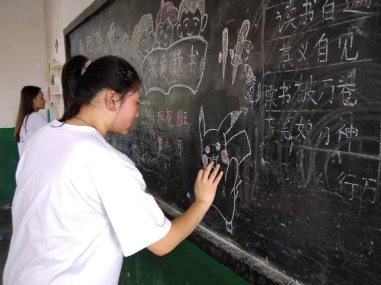 课间,志愿者范江媛与甘艳妮在教室黑板上绘制关于“读书点燃智慧,知识照耀人生”宣传板报,吸引了同学们的眼球,大家纷纷上前围观并参与其中。
