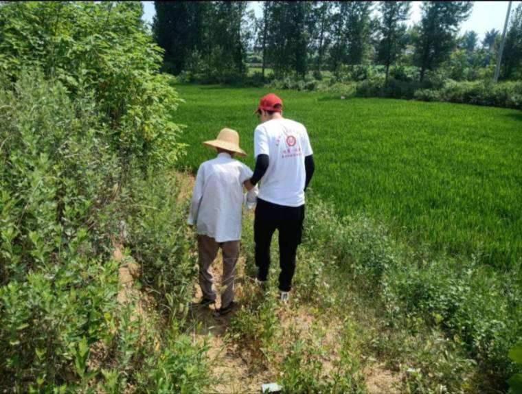 在返回途中,烈日下,一个佝偻的身影在蹒跚前进,队员们连忙冲上前去询问情况,询问过程中,队员们了解到老人已有91岁高龄,顶着烈日只为查看农作物生长状况,因为厉山镇富足社区地处偏远山区,村里的青年人都在外务工,村中以老年人和留守儿童居多,平常主要的收入来源主要就是田地里的农作物,老人正是因为放心不下,所以顶着烈日前往田间查看农作物。田地间地形复杂,十分崎岖,因老人年迈已高,队员们担心老人身体不适,一直陪着老人在田埂上聊天休息,等老人体力恢复后,队员们搀扶老人到田地间查看农作物生长状况,并护送老人回家,一路上,队员们都陪着老人聊天,询问着老人的日常生活情况,并提醒老人要多注意身体状况和饮食卫生等。