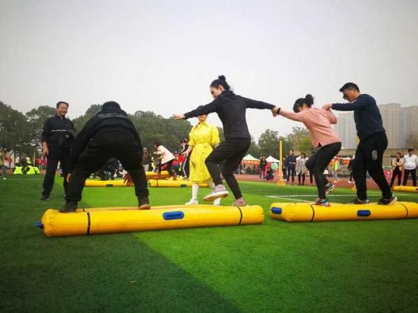 据了解,“同舟共济”是由4名参赛队员手拿2块竹筏站于起跑线后,裁判发令后,4名队员同时站在一块竹筏上,依次交替向前行进,以最后一名队员通过终点并将竹筏收回为计时结束,用时少者名次列前。目的是考察各参赛队员的团结合作能力以及相互协调能力,在行进过程中要时刻保持集中精力和步伐的频率的稳定,负责速度过快或过慢都无法取得好成绩。