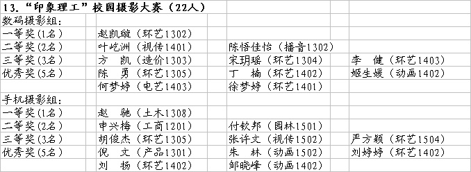 为推动校园文化建设,丰富学生课余生活,建设体现社会主义特点、时代特征和学校特色的校园文化,全面推进成功素质教育,艺术设计学院于2016年3月启动第七届大学生成功素质展示节“印象理工”校园摄影大赛的相关宣传准备工作。据了解,本次摄影大赛分为“数码摄影组”和“手机摄影组”两个组别,要求作品以反映校园为主题,风格不限,内容健康向上,两个组别分别设有一等奖1名 、二等奖2名、三等奖3名,优秀奖5名。
