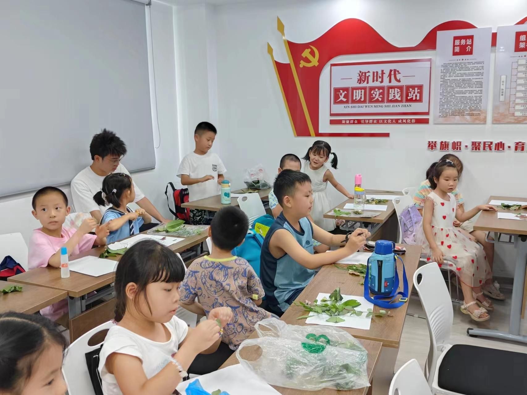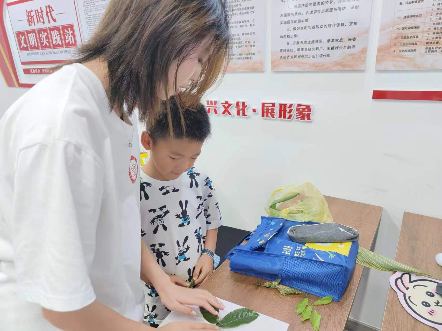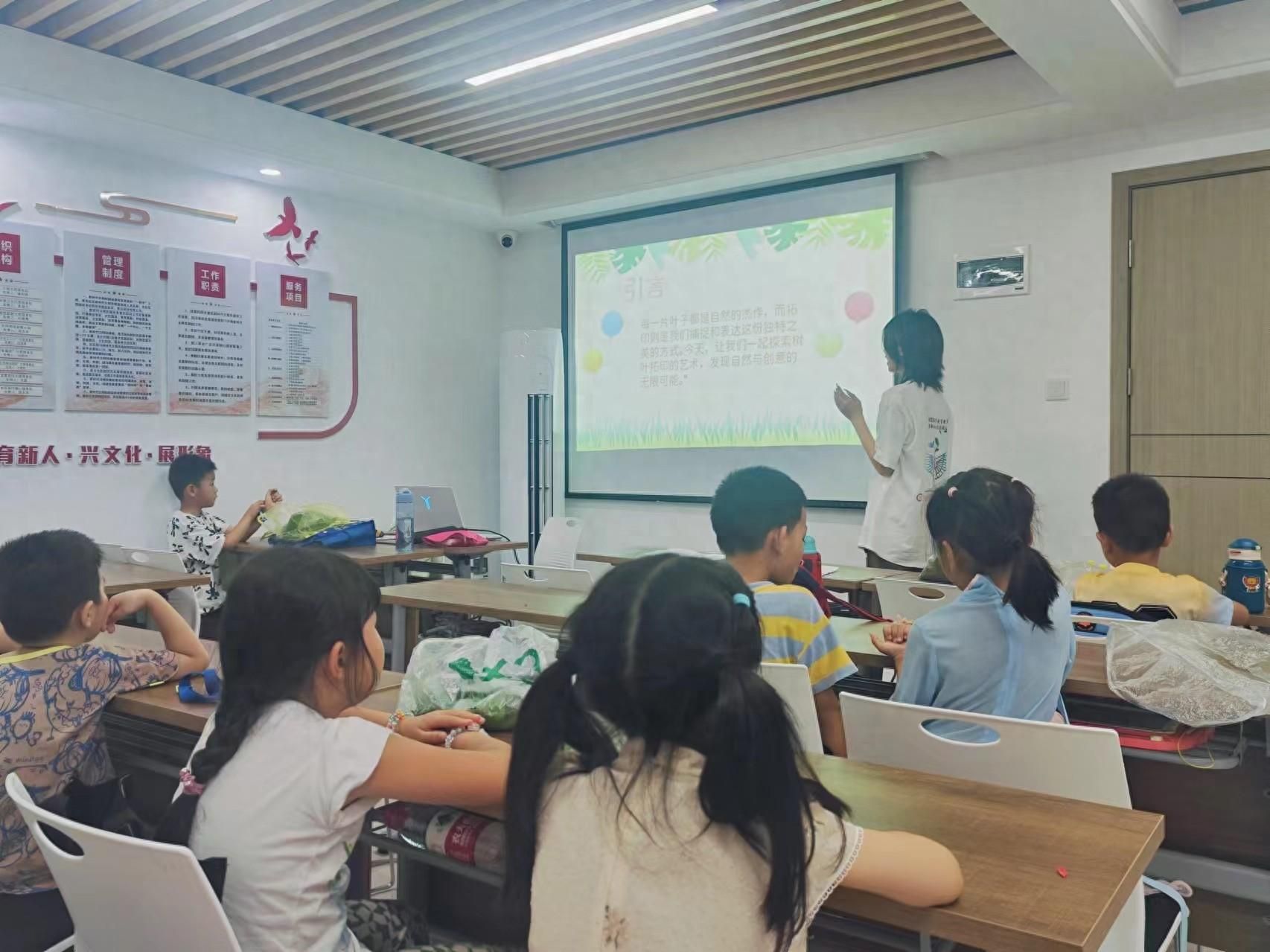 7 月 25 日,在孝感市孝南区东苑社区二楼小教室,“雏鹰圆梦,传承文化之风,共筑青春之梦”小分队为同学们准备了一堂亲近大自然的课程,课程以“叶舞童趣,自然探秘”为主题,旨在让学生在与自然的亲密互动中,发现自然之美,激发无限的创造力和想象力,同时也培养学生们的环保意识,让学生学会珍惜自然资源,保护环境。