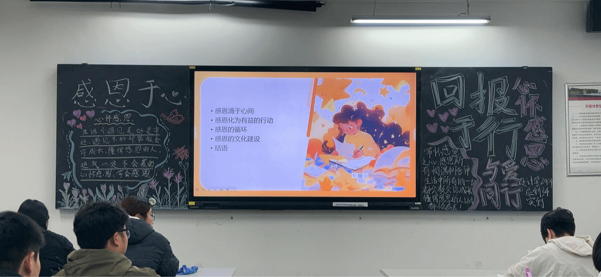 2024 年 11月 23 日在设计2404召开主题班会,雄鹰高翔,白云逸飞,那是蓝天对大自然的感恩;大海壮阔,小溪幽雅,那是河流对大自然的感恩;稻谷芬芳,硕果累累,那是大地对大自然的感恩。