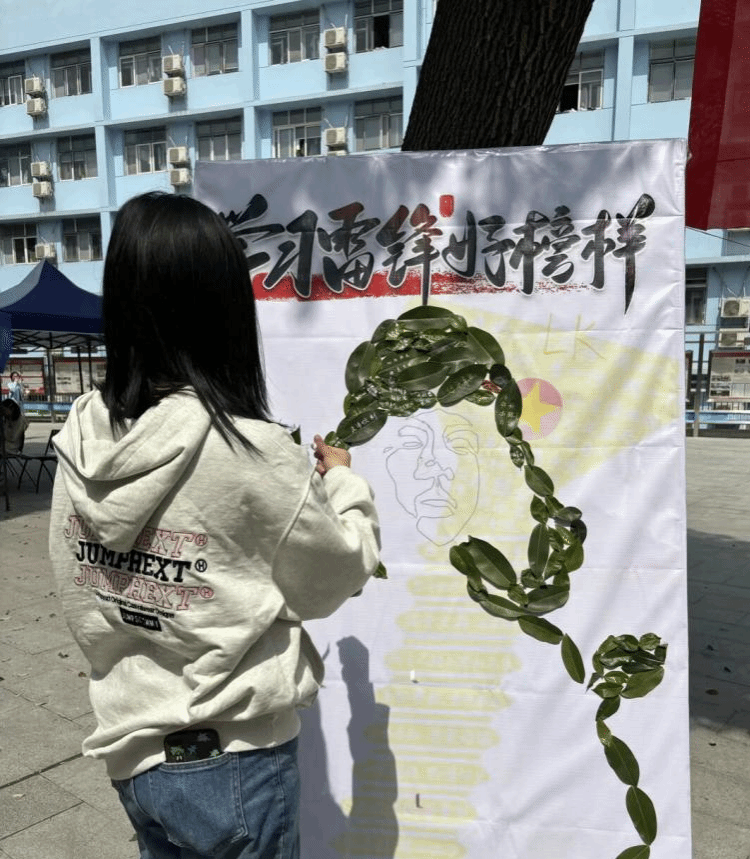 活动当天,校园内东区文化长廊热闹非凡。来自不同学院的同学们齐聚一堂,满怀热情地投入到创作中。大家充分发挥自己的想象力和创造力,巧妙地利用叶子的自然形态,通过书写、拼接、绘画等多种手法,将雷锋的形象栩栩如生地呈现在画布上。有的同学以红叶为基调,展现雷锋热情似火的助人精神;有的同学则用翠绿的树叶,绘制雷锋精神的灿烂光辉。同学们一边创作,一边交流着对雷锋事迹的理解和感悟,现场洋溢着浓厚的学习和创作氛围。