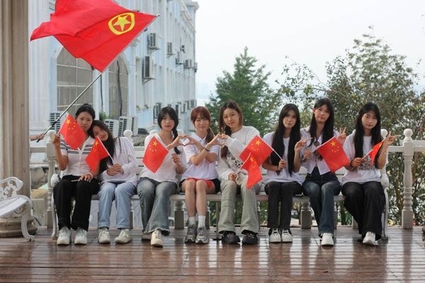 在校园的长椅上,女生们手持国旗,有的比心,有的比耶,脸上洋溢着青春的笑容。旁边飘扬的团旗,与国旗一同,见证着青年学子们的爱国之心,她们用轻松活泼的方式,表达着对祖国的热爱与祝福,展现出青春的朝气与活力。