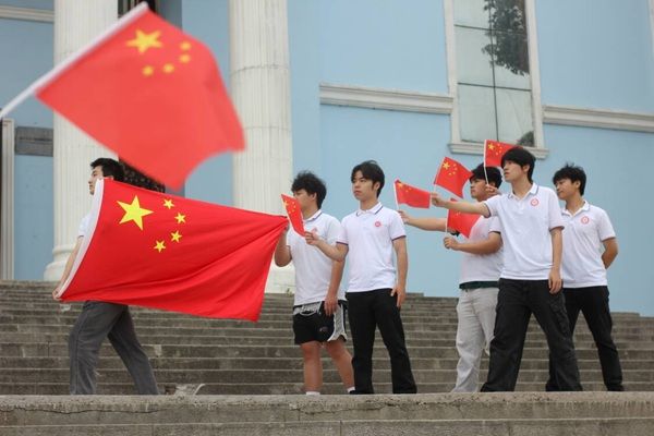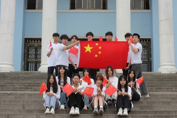 在校园标志性建筑前的台阶上,同学们簇拥着鲜艳的五星红旗合影留念。大家手持小国旗,脸上满是自豪与喜悦,红色的国旗在蓝天与建筑的映衬下,显得格外夺目,这一幕定格下青年学子与祖国紧密相连的瞬间。而当同学们手持国旗,迈着坚定的步伐走下台阶时,飘动的国旗仿佛也在诉说着对祖国的深情,每一个动作都传递出对祖国的崇敬与热爱。