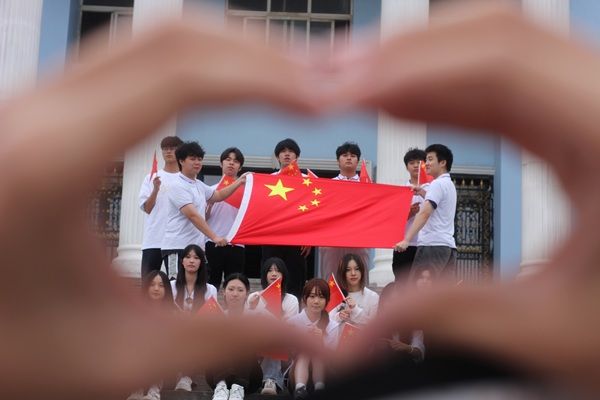 学院建筑旁,同学们与国旗、团旗同框。红色的国旗与团旗交相辉映,同学们或坐或蹲,手中的小国旗紧紧握在手中,眼神中满是对祖国的热爱与对共青团组织的忠诚,彰显出新时代青年与祖国共奋进、与时代同发展的坚定信念。还有同学用双手比心,透过指缝,将对祖国的深情与祝福,定格成永恒的美好画面,这份独特的创意,也让爱国之情更显真挚动人。