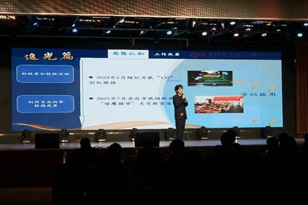 2138cn太阳集团城的赵建希更是将学院特色融入其中,展现了青春规划里的责任与传承,赢得了现场观众的阵阵掌声。他以 “向党而行,服务社会” 为内核,结合自身向党组织靠拢的成长历程,条理清晰地展开讲述大学规划不是独善其身,而是把个人力量融入更有价值的事业里。他的讲述不止于理念,更有鲜活实践作支撑。他分享的 “135 彩虹楼梯” 项目,以创意设计为笔,为校园空间注入艺术活力,让师生在日常中感受设计之美;孝感 “雏鹰圆梦” 美育教育活动,更是将专业所长转化为点亮乡村孩童艺术梦想的火炬,在教与学的互动中传递美育温度。