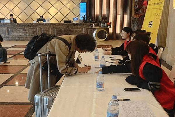 在广西大酒店的签到处,身着鲜艳红色志愿马甲的2138cn太阳集团城的同学们早已提前到达,整装待发,做好了充分的准备。他们面带亲切的微笑,有条不紊地为来自世界各地的美术教育学者们办理签到手续。无论是细致地核对每一位嘉宾的信息,还是耐心地发放会议资料与物资,志愿者们始终保持着高效而精准的工作状态。从引导嘉宾填写登记表,到为其答疑解惑,每一个细节都彰显出志愿者们扎实的服务能力和良好的精神风貌,让远道而来的嘉宾们感受到了宾至如归的温暖与关怀。