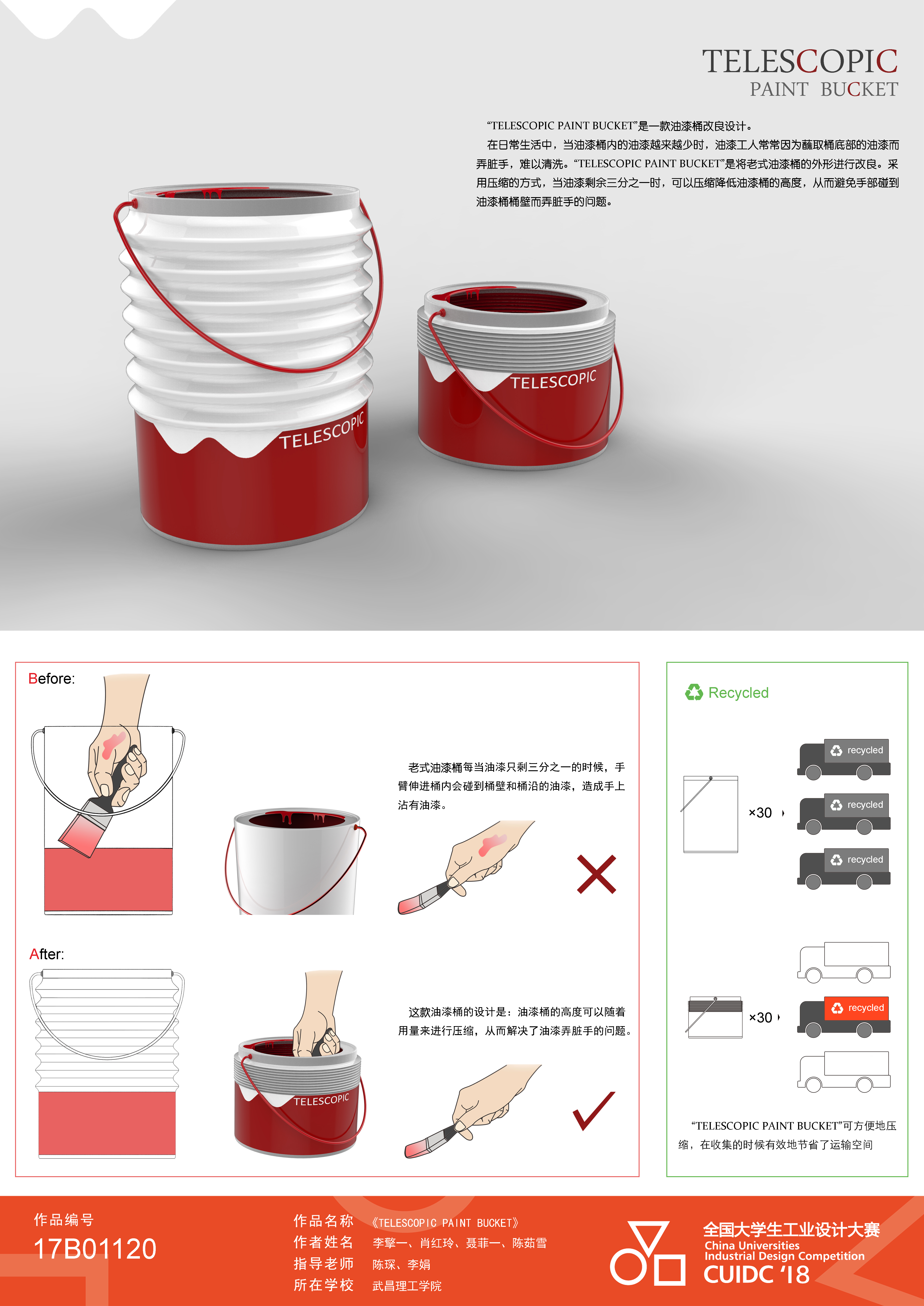 7月28日,2018年全国大学生工业设计大赛全国总赛区复评评审活动在广州美术学院昌岗校区美术馆顺利完成。经过层层筛选,评选出的320件优秀作品将进入到11月下旬全国总赛区的终评评审。我院产品设计系李擎一同学团队的作品《TELESCOPIC PAINT BUCKET》成功通过复评,进入全国赛区终评,终评实物模型正在制作中。