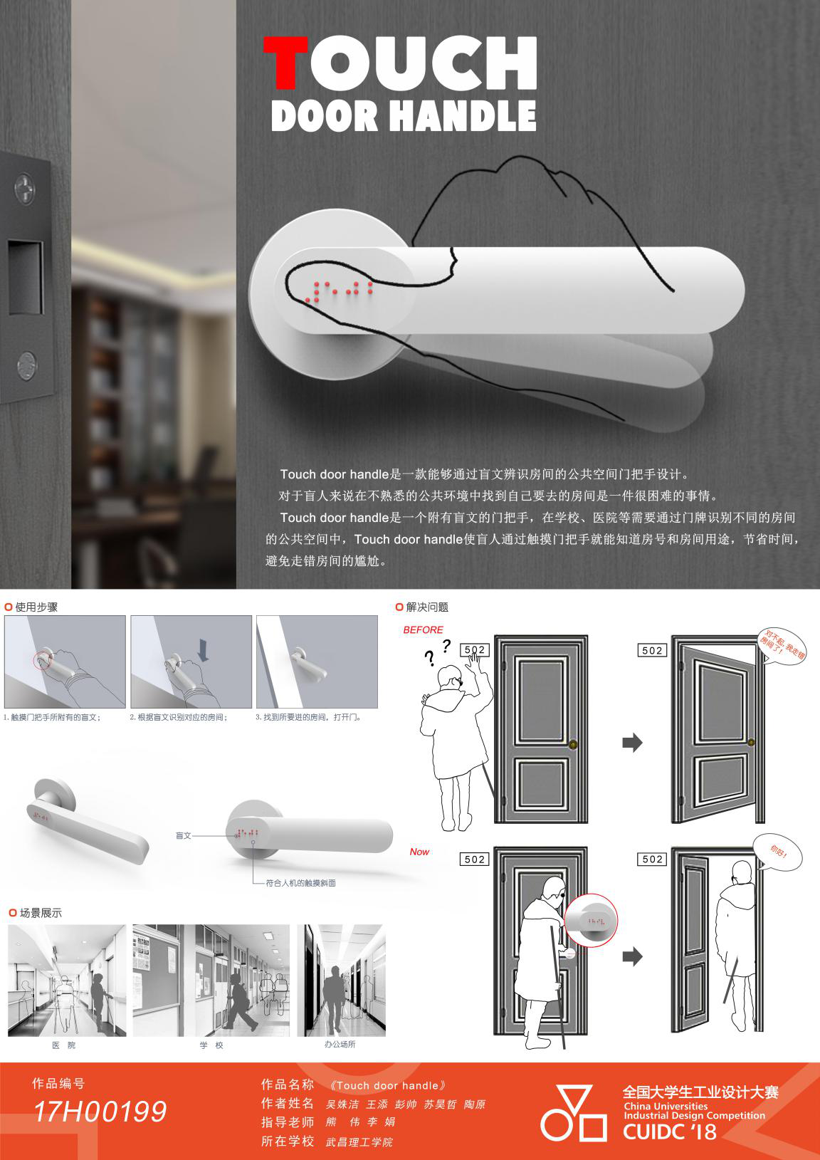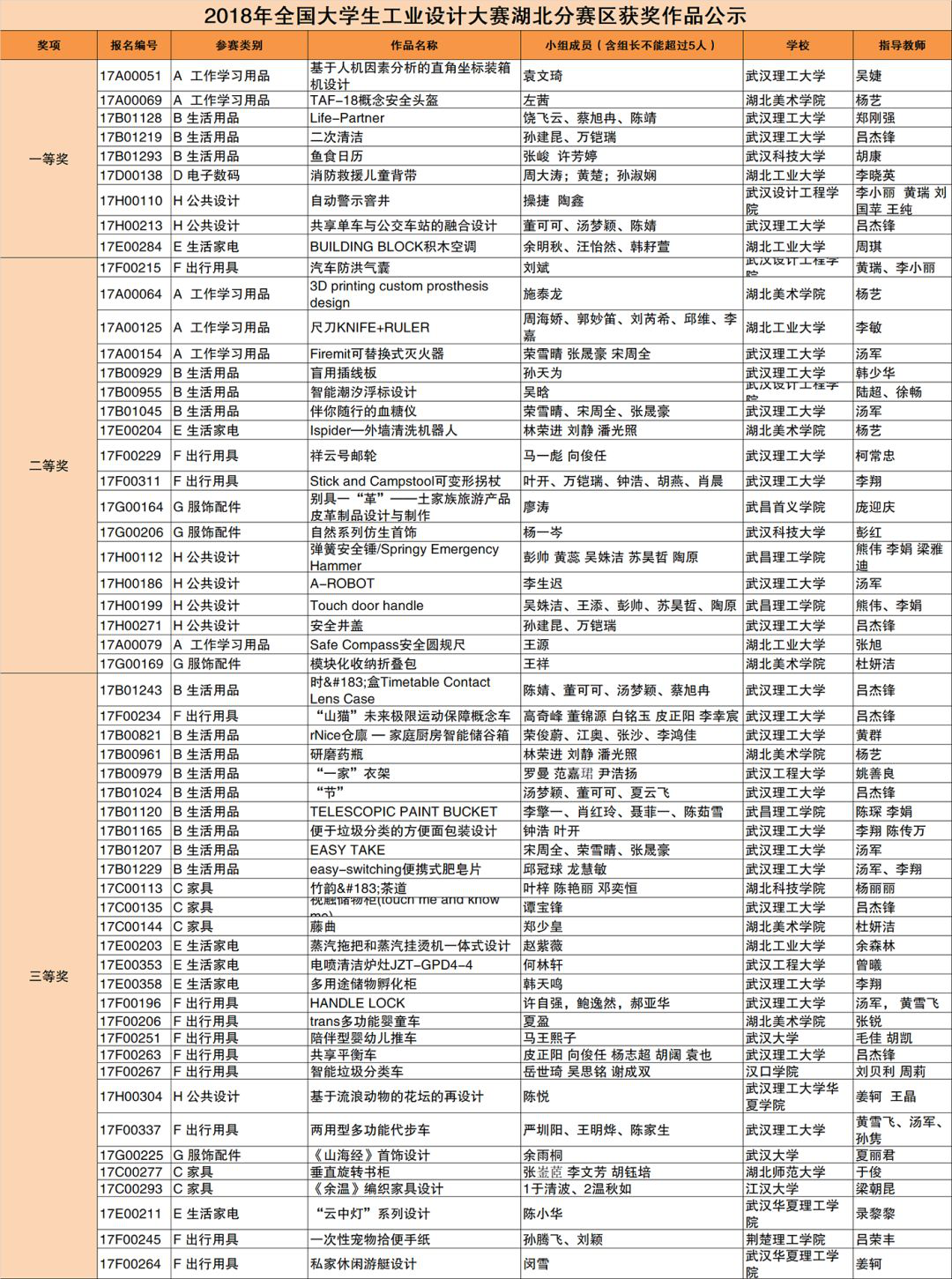 我院产品设计系在“2018全国大学生工业设计大赛”湖北赛区取得佳绩,产品设计系14、15、16级学生共提交设计作品176件,太阳集团2138获得最佳组织奖。其中彭帅同学团队的作品《弹簧安全锤》、吴姝洁同学团队的作品《Touch door handle》获得二等奖;李擎一同学团队的作品《TELESCOPIC PAINT BUCKET》获得三等奖;王家宝、王君娉、孙力等10组同学的作品获得优秀奖。