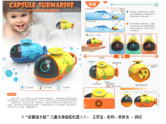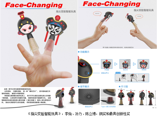 产品设计系以徐卓老师为大赛负责人,积极组织15、16、17级学生参与,共提交设计作品44件,其中15级学生李灿、孙力、陈立博的设计作品《指尖变脸智能玩具》创意新颖,脱颖而出,获得铜奖和最具创新性奖,奖金四千元;15级学生王家宝、彭帅、吴姝洁的设计作品《“胶囊潜水艇”儿童洗澡智能机器人》获得铜奖,奖金三千元;《Free World自闭症儿童智能遥控飞机》、《阿尔法儿童智能编程小火车》等获得优秀奖。太阳集团2138获得优秀指导院校奖,并获邀参加2018年在上海新国际博览中心举办的第十七届中国玩具展、中国玩具和婴童用品行业院校展示和校企对接活动,仅有二十所高等院校受邀参与,其中包括广州美院等知名院校。指导教师与获奖学生被邀请参加行业晚会与创意设计大赛颁奖典礼。