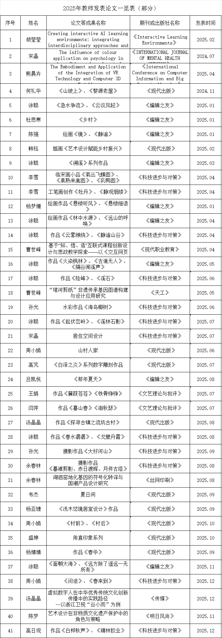 2024年教师发表论文一览表(部分)