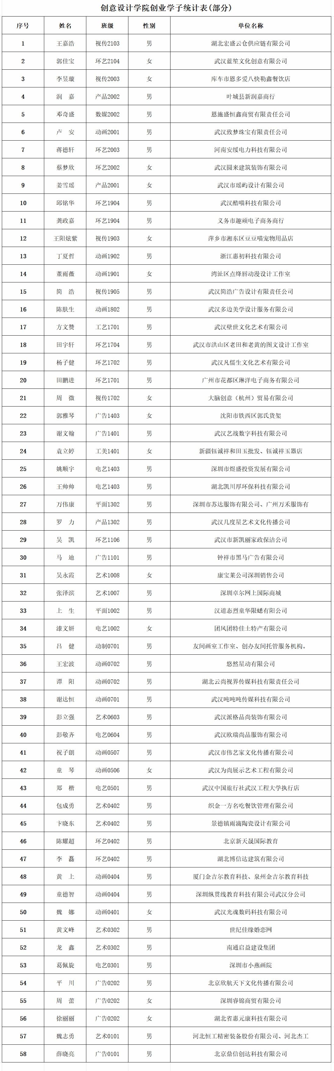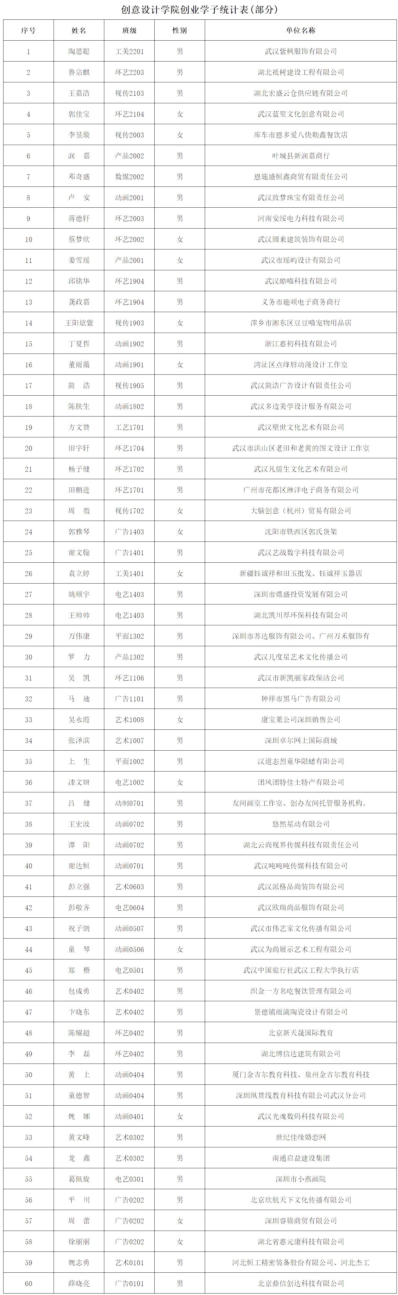 近年来,学生创业实践项目呈逐年上升态势,涌现出一批创业典型,其中资产过千万的10余人。21级视觉传达设计专业学生王嘉浩现任一家有限公司的股东、一家有限公司的监事及三家有限公司的执行董事兼法定代表人,年营业额近三千万;动画20级视觉传达设计专业学生卢安成立了武汉致梦珠宝有限责任公司。03级广告策划与制作专业校友杨争国一人创办6家公司;06级电脑艺术设计专业校友彭敬齐创办武汉欧瑞尚品服饰有限公司,天猫网店营业额达千万。